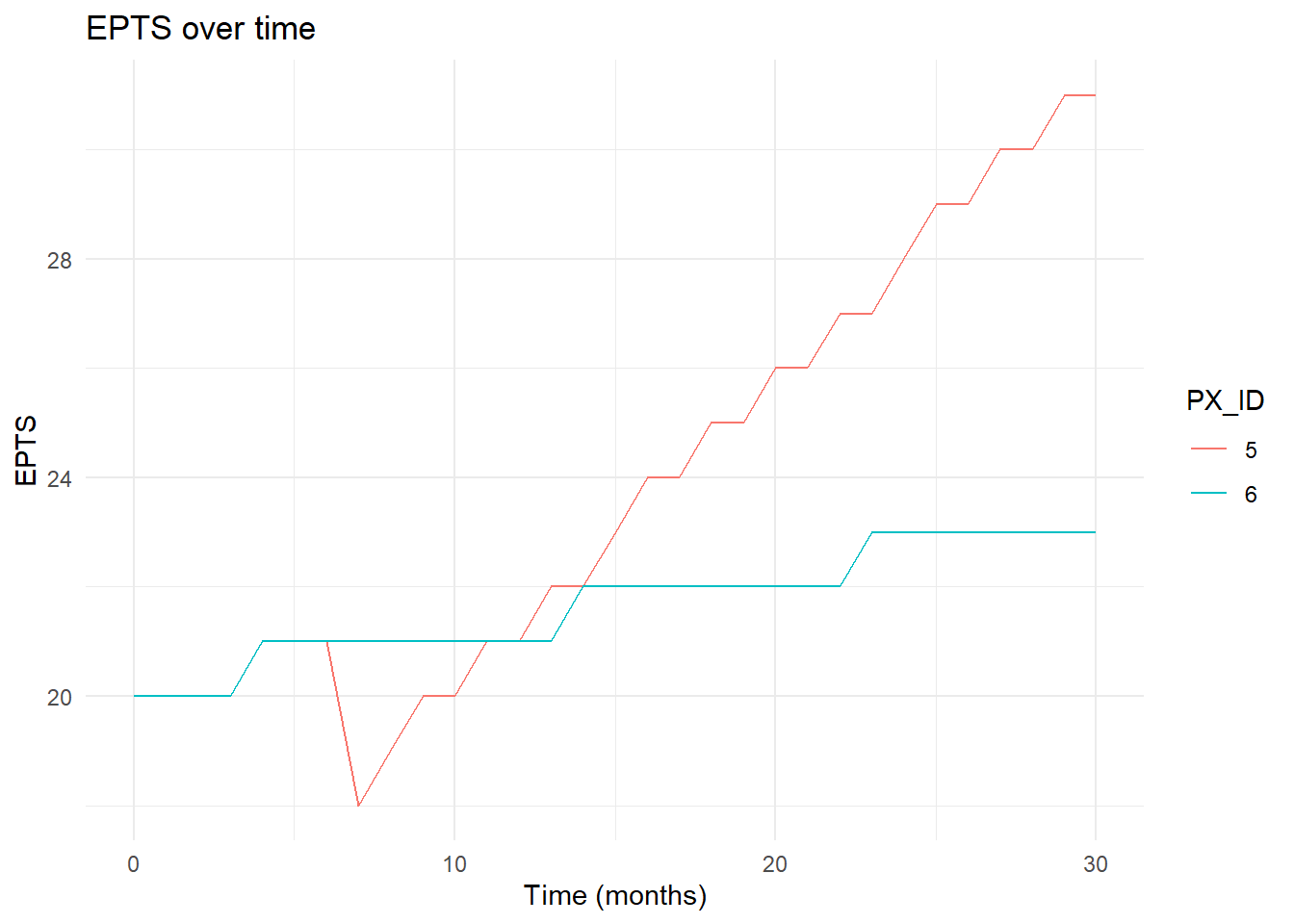 Patients 5 and 6 are an example of two patients who have the same EPTS characteristics but one patient is put on dialysis and the other is not. As we can see here, when patient 5 is put on dialysis it initially lowers their EPTS, but their EPTS soon increases to its previous level and then continues to increase at a much faster pace than patient 6 who is not on dialysis.